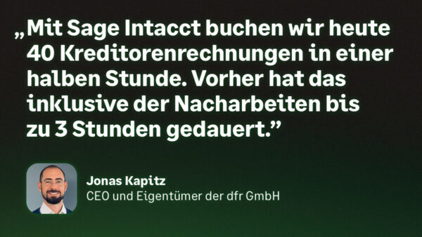 Die DFR GmbH zeigt, was möglich ist. Der Buchhaltungsdienstleister kämpfte mit sechs verschiedenen Systemen und Papierchaos. Nach der Umstellung auf Sage Intacct buchen sie heute 40 Kreditorenrechnungen in einer halben Stunde – vorher dauerte das mit Nacharbeiten bis zu drei Stunden. Das entspricht einer Zeitersparnis von über 80 Prozent. “Mit Sage Intacct haben wir nicht nur Zeit gespart, sondern auch die Fehlerquote drastisch reduziert”, berichtet Jonas Kapitz, CEO der DFR GmbH.