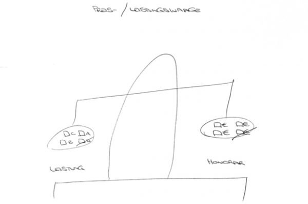 Die meisten reagieren erst einmal verdutzt. Ich erkläre dann: “Sehen Sie mal, Sie nehmen ja rechts beim Preis 10 Prozent weg. Also kippt die Waage nach links, weil die Leistungsseite schwerer ist. Das funktioniert nicht, die Waage ist so nicht ausgeglichen. Das ist nicht fair.”