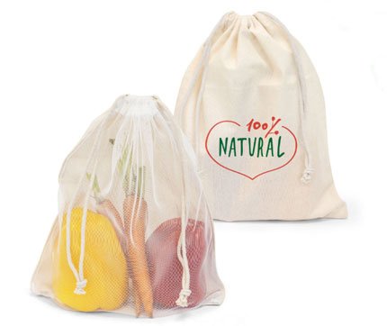 Plastikfreies Einkaufen im Supermarkt scheitert oft in der Obst- und Gemüseabteilung. Die Lösung: wiederverwendbare Obst- und Gemüsebeutel. Aus zertifizierter Bio-Baumwolle, gesehen bei Laprinta, ab 0,83 Cent.