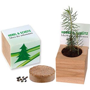 Schenken Sie Kunden und Geschäftspartnern etwas Grün fürs Büro oder zuhause – beispielsweise den Natur-Würfel, in dem eine kleine Fichte heranwächst. Alternativ eignen sich auch Tütchen mit Pflanzensamen als Werbegeschenk. Natur-Würfel, gesehen bei giffits, ab 1,60 Euro pro Stück.