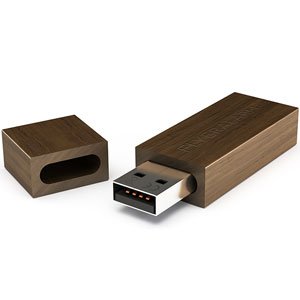 USB-Sticks gibt es wie Kugelschreiber in einer plastikarmen Version. Mit eingraviertem Firmenlogo wird’s noch persönlicher. USB-Stick mit Holzmantel, gesehen bei Flyeralarm.