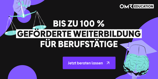 OMR Education bietet geförderte Weiterbildungen für Berufstätige im Online-Marketing an. Bis zu 100 % Förderung für Ihre Weiterbildung. Die Anforderungen an Berufstätige verändern sich stetig. Der Staat unterstützt Sie und Ihr Unternehmen dabei, den digitalen Wandel zu meistern, indem er Weiterbildungskosten übernimmt und Zuschüsse zu Lohnkosten gewährt. Förderstufen: