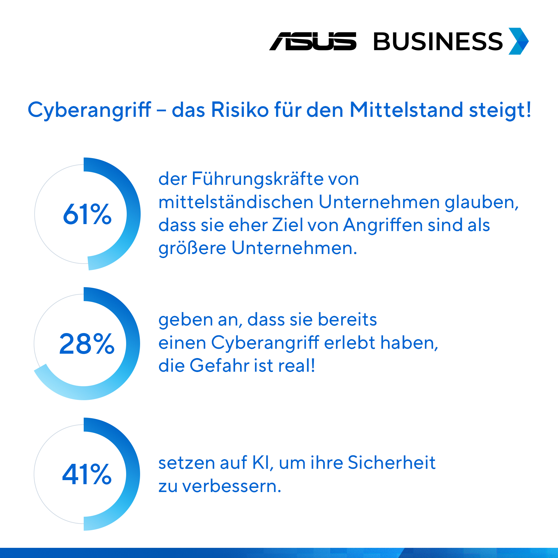 Doch die Zahlen sprechen eine andere Sprache. Laut dem „Future of SMB-Report 2025“ von ASUS sehen sich 61 Prozent der Führungskräfte in kleinen und mittleren Unternehmen (KMU) stärker gefährdet als große Konzerne – und mehr als ein Viertel wurde bereits Ziel eines Cyberangriffs. Das zeigt: Der Mittelstand steht längst im Visier von Cyberkriminellen. Und wer heute nicht aktiv wird, riskiert mehr als nur Datenverlust – nämlich das Vertrauen seiner Kunden und den Fortbestand seines Geschäfts.