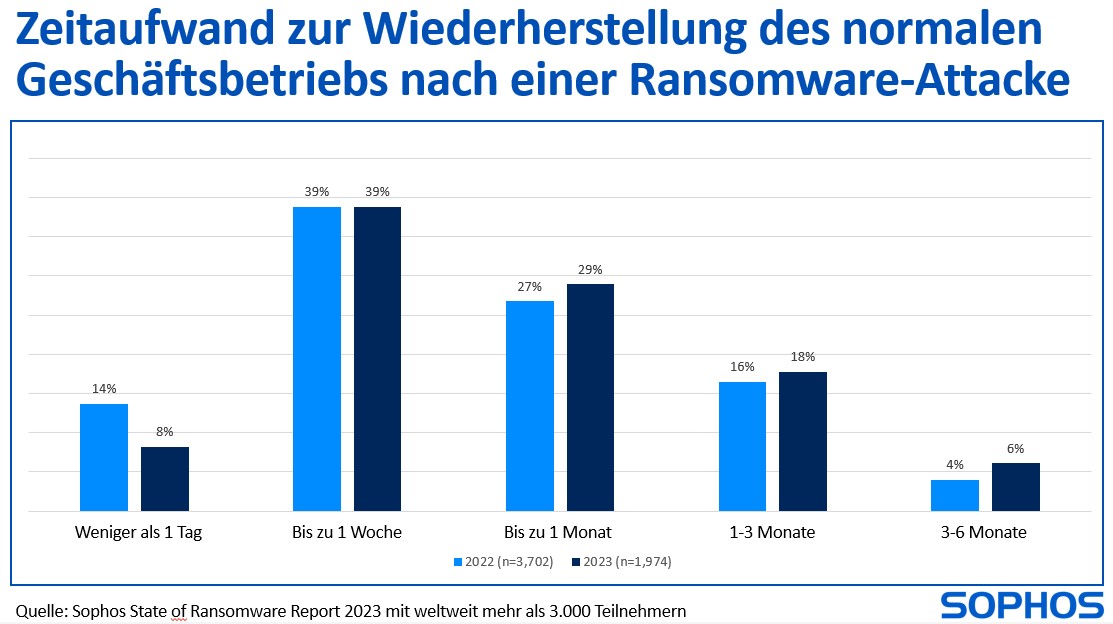 Dass diese rechtliche Offensive Hand und Fuß hat, belegt der aktuelle Ransomware Report von Sophos, in dem Anfang 2023 weltweit 3000 IT-Fachkräfte zum Thema Cybersecurity befragt wurden. So wurden in Deutschland insgesamt 58 Prozent der befragten Unternehmen von Ransomware angegriffen, in 71% dieser Fälle gelang es den Cyberkriminellen, Daten zu verschlüsseln. Weiterhin zeigt die Umfrage aus weltweiter Sicht, dass Unternehmen, die Lösegeld für die Entschlüsselung ihrer Daten zahlten, ihre Wiederherstellungskosten zusätzlich verdoppelten: die durchschnittlichen Wiederherstellungskosten betrugen 750.000 Dollar gegenüber 375.000 Dollar für Unternehmen, die Backups zur Datenwiederherstellung verwendeten.