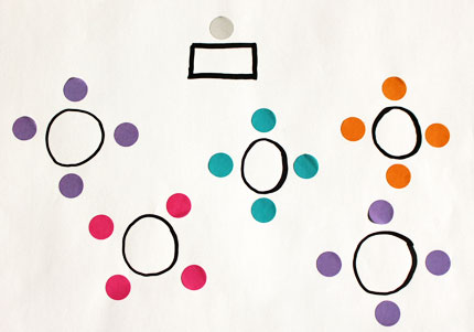 © impulseBeim Cluster sitzen Kleingruppen an einzelnen, im Raum verteilten Tischen und arbeiten an Einzelprojekten. An einer Seite im Raum kann ein Moderator oder der Chef stehen oder sitzen, der die Arbeit der Gruppen koordiniert. In festen Zeitabständen können die Kleingruppen ihre Ergebnisse vorstellen und mit denen der anderen Gruppen zusammenführen. Bis ein Gesamtergebnis besteht, können die Kleingruppen immer wieder an ihre Tische zurückkehren und weiter in kleinen Teams arbeiten. Der Moderator oder Chef kann hier den gesamten Entstehungsprozess eines Projektes verfolgen.