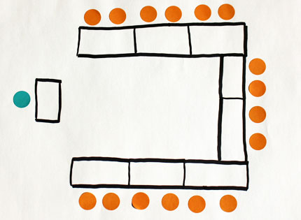 © impulseBeim Rechteck werden die Tische – wie der Name schon sagt – zu einem Rechteck, oder “O”, angeordnet. Alle Sitzpositionen sind gleichwertig, keiner hat den Vorsitz, dadurch findet eine Diskussion oder Besprechung auf Augenhöhe statt. Der Raum in der Mitte der Tische dient als Schutzraum, er hilft manchen Mitarbeitern, sich besser zu öffnen.