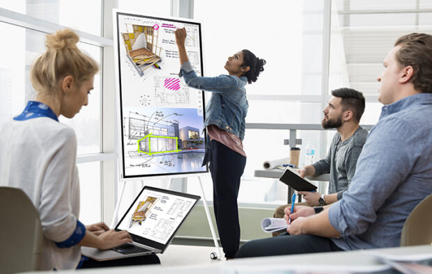 Hochauflösende, flexibel einsetzbare Monitore sind allerdings nur ein Baustein einer neuen digitalisierten Arbeitswelt. Was es ebenso braucht sind smarte Oberflächen, an denen egal von wo gemeinsam am Konzept gefeilt und die neueste Idee aus der Taufe gehoben werden kann. Der Flip 2, das digitale Flipchart von Samsung, bietet dafür reichlich Möglichkeiten: Das UHD-Display mit Objekterkennung ermöglicht flüssiges Schreiben und Zeichnen in einer Vielzahl von Stilen und Farben. Bis zu vier Personen können vor Ort gleichzeitig daran arbeiten – und sich kreativ austoben: Digitale Öl- und Wasserfarben lassen Skizzen und Zeichnungen in einem hohen Detailgrad entstehen. Daneben können Bilder bearbeitet, zugeschnitten und in Dokumentenlisten gesammelt werden. Teilnehmerinnen und Teilnehmer, die nicht vor Ort sind, können sich virtuell auf den Flip 2 draufschalten. Möglich macht das eine Kooperation zwischen Samsung und Cisco: WebEx on Flip kombiniert Webex Teams mit dem Webex Room Kit Mini. Über das digitale Flipchart können nun Mitarbeitende per Video zugeschaltet werden und gemeinsam mit dem Team vor Ort an Präsentationen, Fotos, Grafiken sowie an anderen Dokumenten arbeiten. Nach Ende des Meetings lassen sich mit einem Klick die erarbeitenden Inhalte per Mail direkt an alle Teilnehmenden versendet – ohne zeitaufwendige Fotodokumentation.