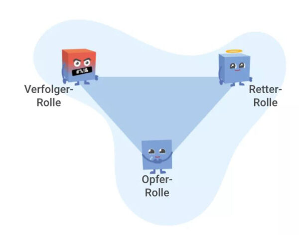 Karpman fand insgesamt drei Rollen: Den Verfolger, den Retter und das Opfer. Treten Menschen miteinander in Beziehung, besetzt jede der beteiligten Personen – wie in einem Bühnendrama – eine dieser Rollen. „Die drei Positionen werden in einem auf der Spitze stehenden Dreieck dargestellt. Oben stehen Verfolger und Retter, unten das Opfer“, erläutert Raebricht.
