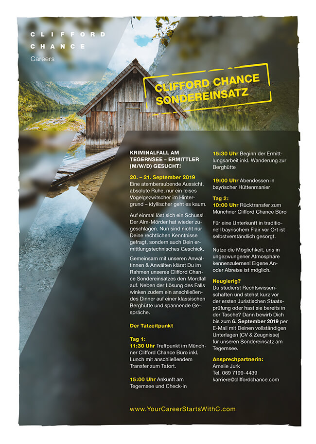 Clifford Chance gehört zu den zehn größten Wirtschaftskanzleien Deutschlands und konkurriert mit anderen Kanzleien jedes Jahr um die besten 10 Prozent der Jura-Absolventen. „Um alle Stellen in den Top-Kanzleien zu besetzen, müsste es etwa doppelt so viele sehr gute Absolventen geben“, sagt Nicola von Tschirnhaus*, Head of Recruitment & Employer Branding bei Clifford Chance in Frankfurt. Üblicherweise laden Großkanzleien Bewerber für einen Kennenlern-Tag in ihr Büro ein. „Aber wenn Sie damit in einer Stellenanzeige werben, stechen Sie nicht aus der Masse hervor.“ Bei einem Teamabend kamen Tschirnhaus und ihre Kollegen auf die Idee, ein Event zu veranstalten: In der Nähe des Tegernsees sollten die Kandidaten einen fingierten Mordfall lösen, bevor sie sich beim Abendessen genauer über die Karrierechancen in der Kanzlei informieren konnten. „Auf diese Weise wollten wir auffallen und gleichzeitig mehr über die fachlichen, aber auch über die sozialen Kompetenzen der Bewerber erfahren.“
