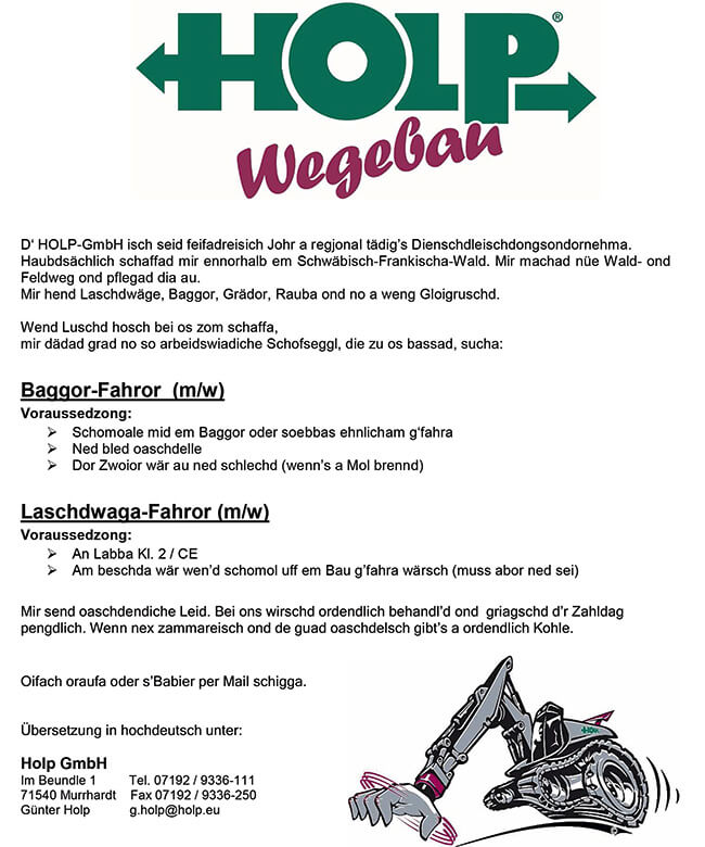 Günter Holp stellt in Murrhardt bei Stuttgart Teile für Bagger her, etwa Löffel und Greifer. Zudem bietet er Wegebauarbeiten an. Der Unternehmer beschäftigt ein Team von rund 30 Mitarbeitern. Wenn er neue Leute sucht, inseriert er in der Lokalzeitung. „Früher haben sich nur ein oder zwei Bewerber gemeldet“, erzählt Holp. Bis er Neues ausprobierte. Die Idee kam ihm im Wirtshaus. Dorthin geht er regelmäßig zum Stammtisch, mit dabei ein Baggerfahrer. Dieser bezeichnete sich an einem Abend scherzhaft als „Schofseggl“. Frei übersetzt: ein Arbeitstier (Schof=Schaf, Seggl=Sack), das unermüdlich für die Firma schuftet. Das brachte Holp ins Grübeln. So einen Mitarbeiter wünschte er sich: fleißig und bodenständig. Wie müsste wohl die Stellenanzeige formuliert sein, damit dieser sich bewirbt? Am besten auf Schwäbisch, dachte Holp. Als er Anfang 2017 einen Baggerfahrer suchte, probierte er seine Idee aus: Er schrieb die Stellenanzeige in Mundart und veröffentlichte sie im Backnanger Wochenblatt.