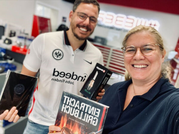 Zu guter Letzt ist es mir wichtig, Mitarbeiter auch gebührend zu verabschieden. Zum einen, weil ich damit die gute Leistung und den Einsatz für das Unternehmen anerkennen möchte. Aber auch, weil ich jeden auf Augenhöhe behandele und überzeugt bin, dass man sich im Leben immer öfter sieht. Für Andreas gab es zum Abschied ein paar Geschenke seines Lieblingsvereins Eintracht Frankfurt und gute Wünsche für seine neue Aufgabe.
