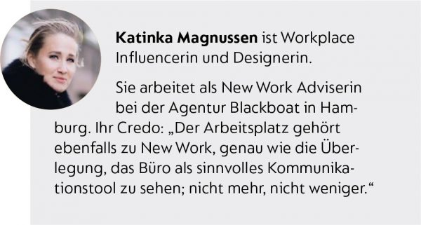 Die Arbeitswelt ist in Bewegung. Im Zuge von Digitalisierung und New Work kommen viele Normen und Prozesse auf den Prüfstand. Wenn es nach Katinka Magnussen geht, würde es nämlich nicht reichen, wenn nur die Büro-Infrastruktur auf den neuesten Stand gebracht wird. Auch die Arbeitskultur sollte weiterentwickelt werden. Vielerorts ist das schon im vollen Gange. New Work bedeutet mehr als Pflichterfüllung und Geldverdienen. Der Wunsch nach einer Tätigkeit, in der die eigenen Talente und Meinungen eingebracht werden können, ist groß.