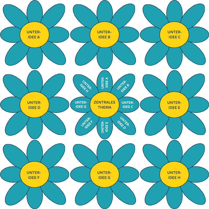 Anschließend überlegen Sie sich Gedanken, Ideen oder Themen, die mit dem, was im Zentrum steht, zusammenhängen – und schreiben jene, die Ihnen am besten vorkommen, in die acht Blütenblätter.