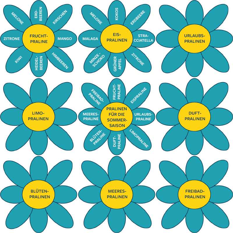 Dann überlegt sie, was ihr spontan dazu einfällt. Sie notiert sich zum Beispiel Fruchtpralinen und Eispralinen als Sommerprodukte. Diese Ideen macht die Konditorin im nächsten Schritt zum Zentrum neuer Blumen. In deren Blütenblätter schreibt sie Geschmacksrichtungen für Frucht- und Eispralinen. Das könnte dann zum Beispiel so aussehen: