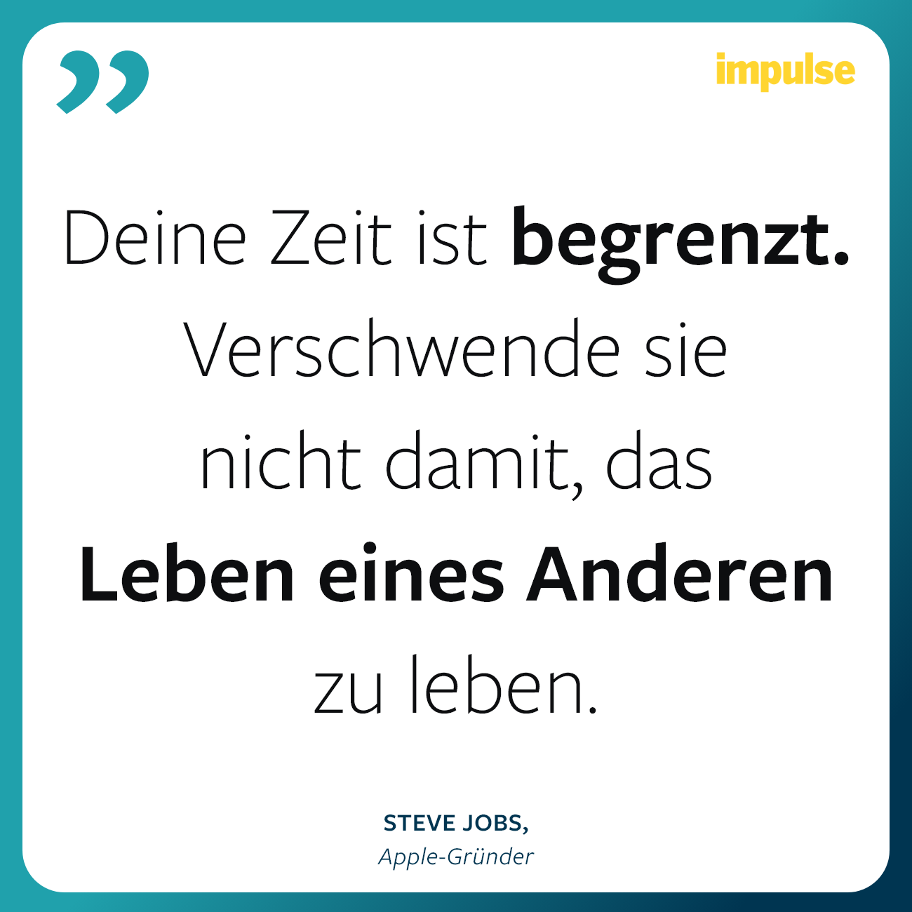 “Deine Zeit ist begrenzt. Verschwende sie nicht damit, das Leben eines Anderen zu leben. Lass nicht zu, dass der Lärm anderer Menschen deine eigene innere Stimme übertönt. Hab den Mut, deinem Herzen und deiner Intuition zu folgen.”