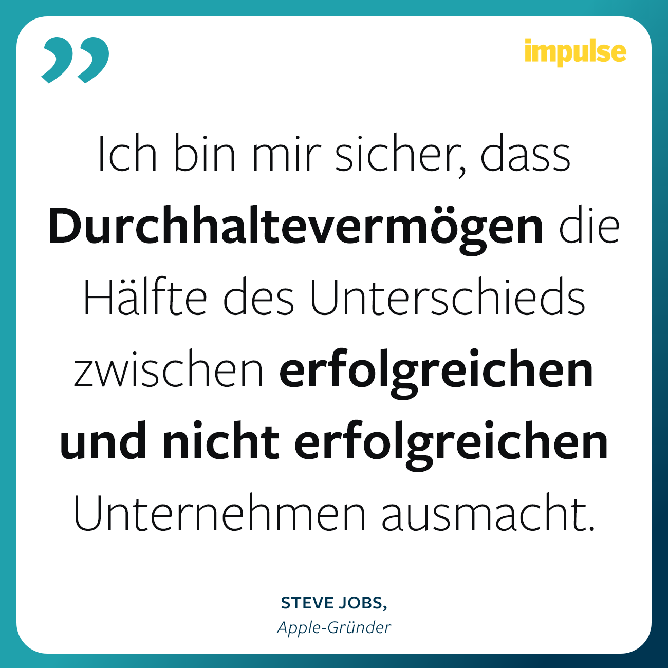 “Manchmal trifft dich das Leben am Kopf wie ein harter Stein. Verliere dann nicht den Glauben. Nachdem ich bei Apple gefeuert wurde, war die Tatsache, dass ich liebte, was ich gemacht hatte, das Einzige, das mich weitermachen ließ. Deshalb: Finde, was du liebst. Das gilt sowohl für die Liebe als auch für die Arbeit. Und der einzige Weg, um wirklich zufrieden zu sein, ist etwas zu tun, von dem zu überzeugt bist, dass es eine großartige Arbeit ist. Und der einzige Weg, eine großartige Arbeit zu machen, ist zu tun, was du liebst. Wenn du es noch nicht gefunden hast: Suche weiter! Wenn du es gefunden hast, wirst du es mit jedem Schlag deines Herzens spüren.”