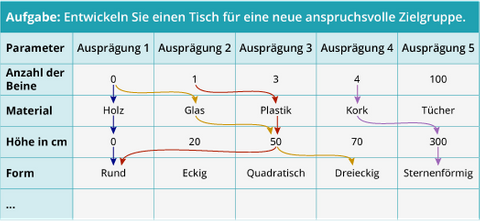 Beim Nachdenken über die möglichen Ausprägungen eines Parameters sollten Sie bewusst ausgetretene Wege verlassen. Die ersten Ausprägungen, auf die man kommt, sind meist die gängigen Varianten. In unserem Tischbeispiel also die Ausprägungen „viereckig“ oder „aus Holz“. Dieses „In-the-box“-Denken fällt meistens leicht. Expertin Kaesler rät aber dazu, bei den weiteren Ausprägungen bewusst zu übertreiben und „out of the box“ zu denken. Nur so erhalten Sie auch innovative Ergebnisse.